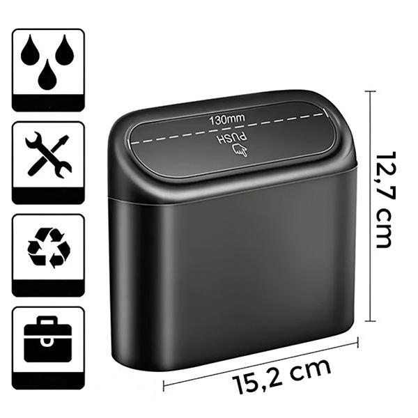 Dieser kompakte Mülleimer hält Ihr Fahrzeug sauber und organisiert, ohne zu viel Platz zu beanspruchen. Sein Design bietet ein großes Fassungsvermögen für die täglichen Abfälle, was ihn praktisch und unauffällig macht.