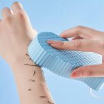 Der sanft schrubbende Schwamm entfernt abgestorbene Hautschüppchen und sorgt für ein frisches Strahlen der Haut.