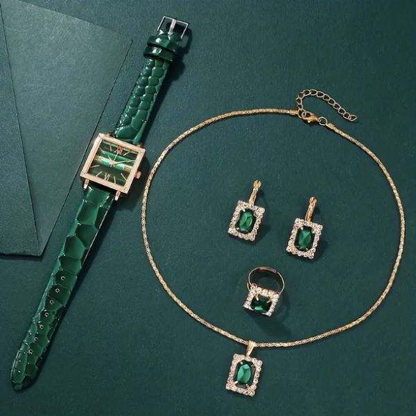 Dieses schicke Ensemble besteht aus quadratischen Quarzuhren mit Vintage-Zeigern in auffälligen Grüntönen, die durch ein schillerndes Strassstein-Schmuckset ergänzt werden. So kannst du sowohl deinen eigenen Stil aufwerten als auch die Eleganz mit deinen Liebsten teilen. 🎁⌚💚