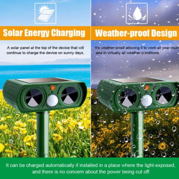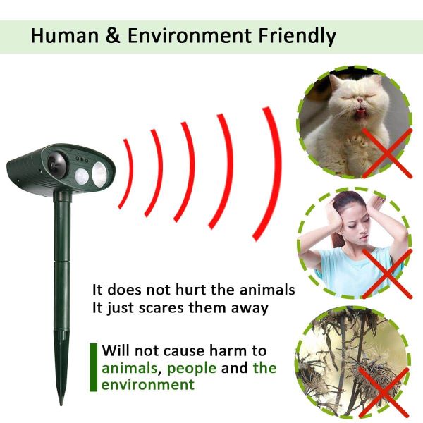 Diese Tierabschreckung ist sehr einfach zu bedienen: Befestigen Sie sie am Boden und schalten Sie sie ein. Es wird mit Hilfe von Solarenergie aufgeladen. Es ist aus hochwertigem Material gefertigt und wasserdicht, geeignet für alle Wetterbedingungen.