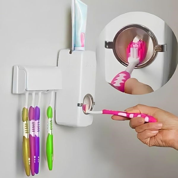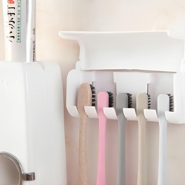 Bringen Sie Ordnung in Ihr Badezimmer mit unserem selbstklebenden Zahnpastaspender und Zahnbürstenhalter, der Platz für 5 Bürsten bietet. Geben Sie die perfekte Menge an Zahnpasta aus und halten Sie Ihre Zahnbürsten trocken und hygienisch!